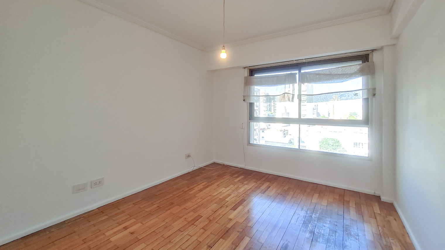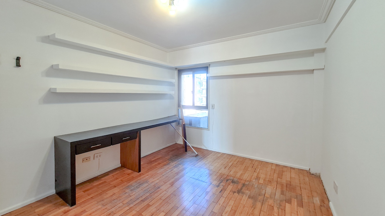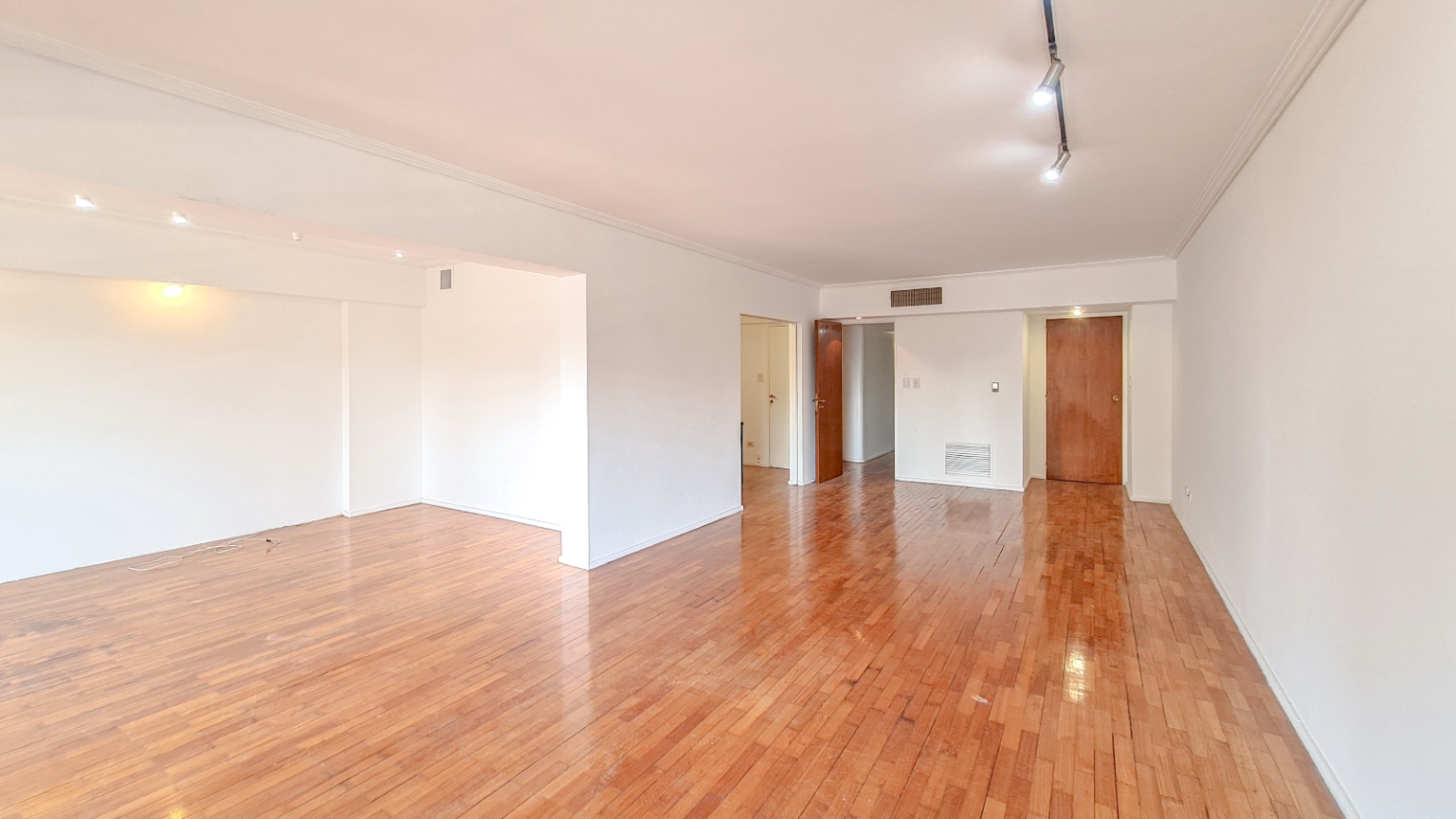 Doble ingreso, principal al living de 10 x 6 con pisos de madera, espacio de estar/TV y escritorio independiente. Balcón corrido al frente. Toilette de recepción.